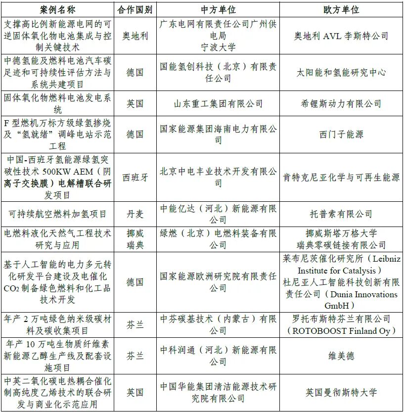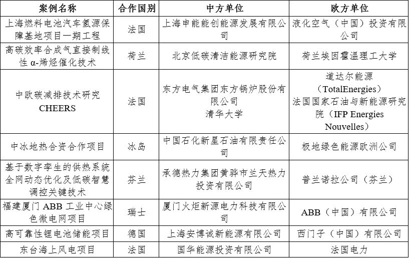 经中欧双方专家联合评审,最终遴选出首批中欧能源合作典型案例(已建成投运)8 项(详见附表1)、首批中欧能源合作典型案例(正在实施)11 项(详见附表 2),合作国别涉及芬兰、英国、法国、德国等 12 个欧洲国家,合作领域覆盖氢能、智慧能源、新型储能、海上风电等多个重点方向,充分展现了中欧能源合作的多维度、深层次、高水平的特点。首批典型案例旨在坚定中欧能源互利合作的良好氛围、打造可复制的样板工程,引领和推动更多技术成果转化落地,为中欧两国人民带来实实在在的绿色福祉与可持续发展红利。