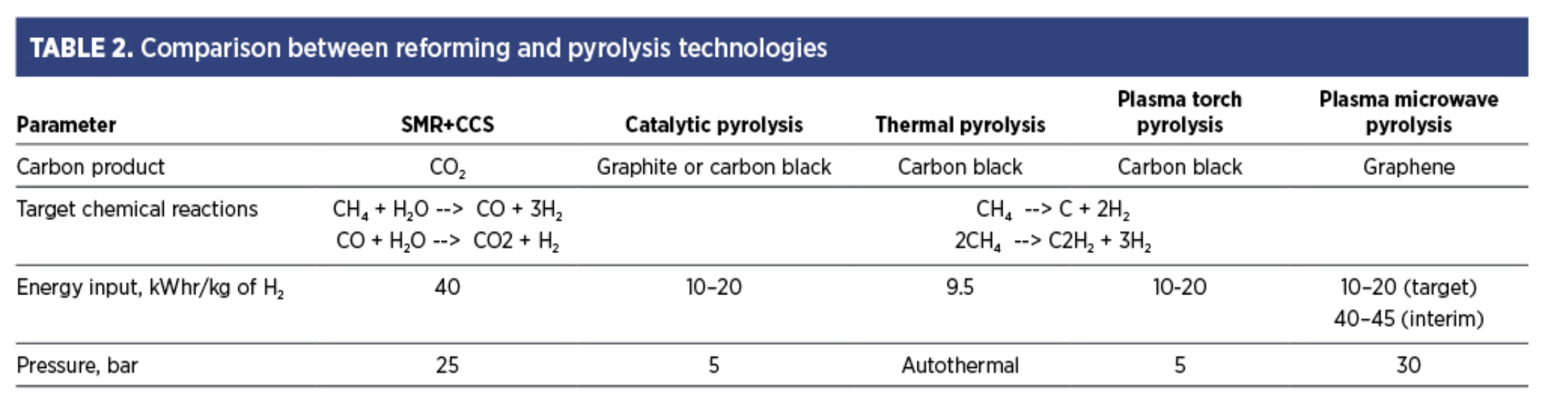 SMR 与 CH₄ 热解。表 2 显示了 CH₄ 重整和 CH₄ 热解之间的差异。碳从 SMR 单元中以 CO₂ 的形式排 放,而在所有类型的热解中,碳以固体形式(石墨、石墨烯和/或碳黑)被捕获。热解消除了碳捕获和储存 (CCS) 来产生无二氧化碳 H₂ 的需要。此外,CH₄ 热解大约是 SMR 过程所需能量的一半,才能以较低的 H₂  压力输出产生相同数量的 H₂ 。然而,如果 H₂ 被压缩到 30pa 作为输出,SMR 和 CCS (SMR+CCS) 的能量输入等同于热解等离子体微波法 (表 2)。由于压缩的额外能源成本,SMR+CCS 的能量输入与微波等离子体相似。压缩 CH₄ 热解技术的能源成本比为 1 kWhr/kg 的 H₂ 。