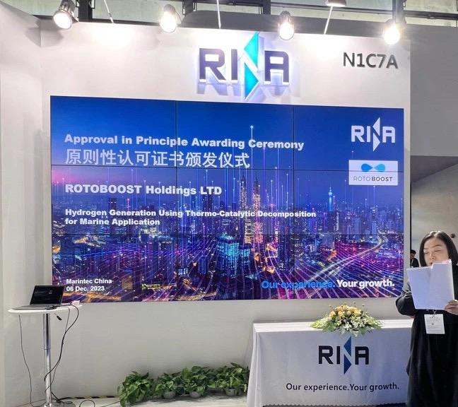 On December 6, RINA (Italian Classification Society) granted the Certificate of Approval in Principle for the design of Hydrogen Generation using Thermo-Catalytic Decomposition for Marine Application developed by ROTOBOOST at the Marintec China 2023 exhibition in Shanghai.